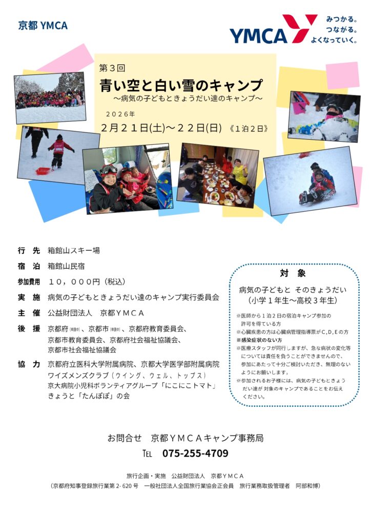 病気により、(一般的な)キャンプ活動に参加できない子どもたちにもキャンプに参加することができるように、京都YMCAでは「青い空と白い雪のキャンプ」と題して、病気の子どもときょうだいたちのための冬のキャンプを開催します。