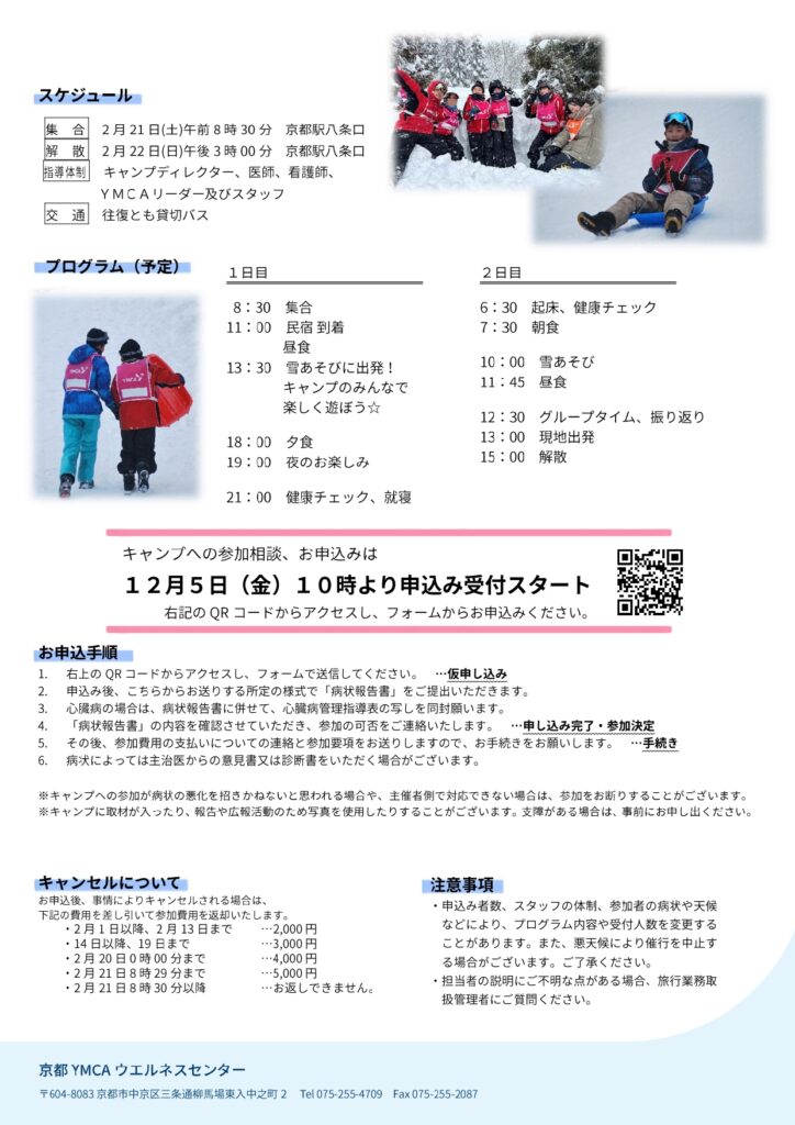 参加費 10,000円(子ども夢基金、京都YMCA障がい児支援資金から助成を受けて実施します)