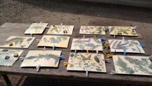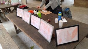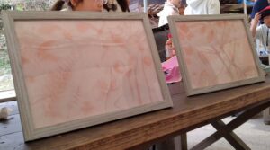 戻ってくると、感光紙に置いた自然物のシルエットが紙上に、柔らかく浮かび上がってきていました・・・その出来上がりを額に入れれば「玄関に飾ったら映えそう!」とみんなが口をそろえた素敵な絵画的作品に仕上がり、一同大満足!