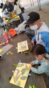 ファミリー参加者とボランティア計20名が集い、一同はうららかな日差しに春の訪れを感じながら、自然物を活かしたアート制作に取り組みました。