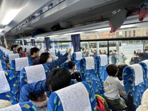幼児キャンプの子どもたちと一緒にバスに乗って、マキノ高原に出発しました。
