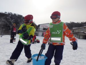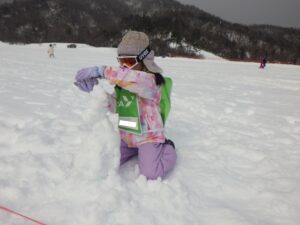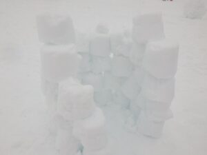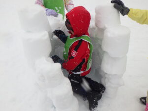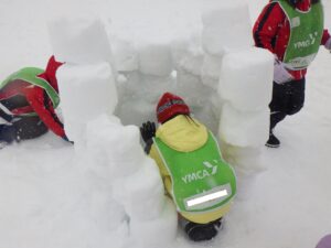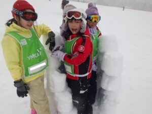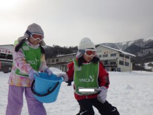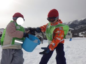 キャンプのみんなで遊ぶ時間もとりました。まずは、バケツに雪を汲んで大きなタワーを作る遊び。