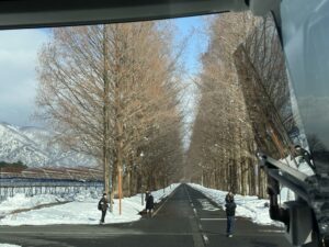 メタセコイアの道を過ぎればすぐにゲレンデ!真っ白な世界が広がっています。お日様も出ていたので寒すぎず気持ちがいい!