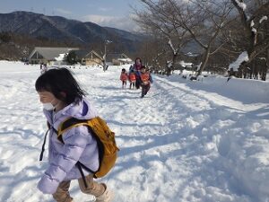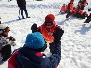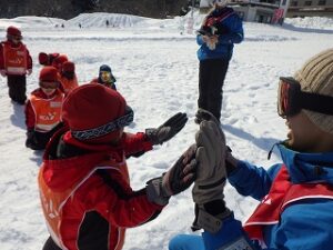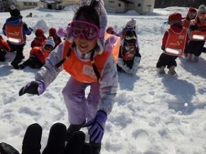 ふかふかの雪の上で、ウサギになったりカニになってリレーを楽しみました。