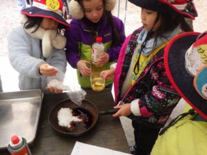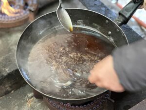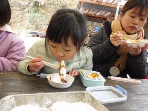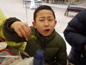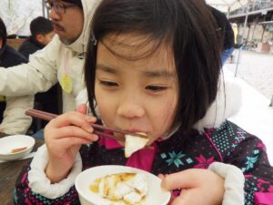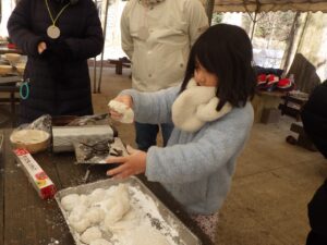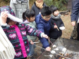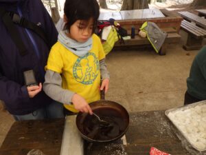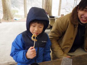 焚き火に人が集まっていたので覗いてみると、炙り餅をしていました!なるほど!!