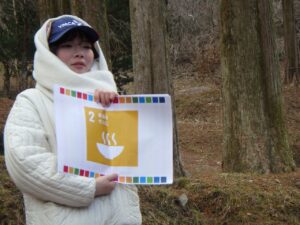 ゆっくり座ってリーダーのお話を聞く時間です。まずはワールドチャレンジャーの時間。ゆらリーダーがSDGsの「飢餓をゼロに」についてお話してくれました。