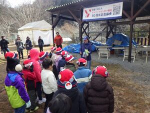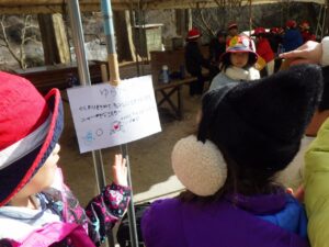朝から雪が降っていた今日は ファミリーオープンプログラムの日。子どもたちの家族も一緒に参加できる活動です。みんなで1台のバスに乗って出発!