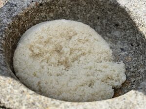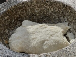 まずは、お父さん方に協力していただいて、こね(すりつぶし)ていきます。