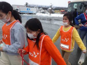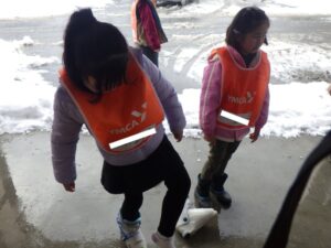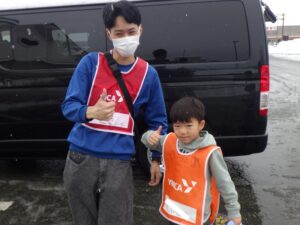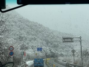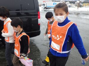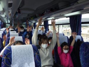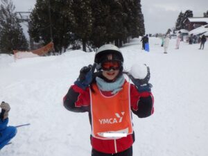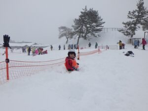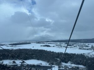 バスの中では歌を歌ったりゲームをしたりして過ごしました。珍しく大津からこの雪景色!スキー場もたくさん雪があるんだろうなあ。
