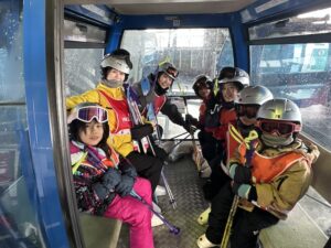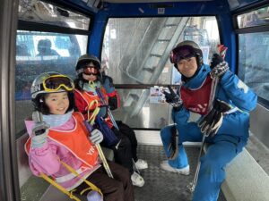 青色のゴンドラに乗ってスキー場へ出発!