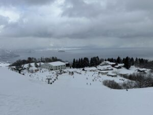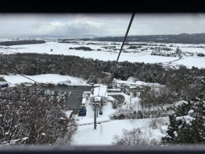 ゴンドラからみた山麓はやっぱり真っ白。奥には琵琶湖が見えます。