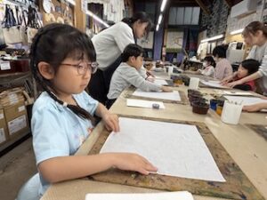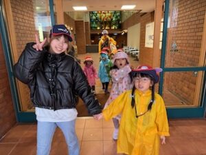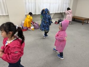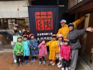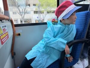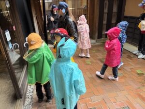 午後は京友禅のハンカチ作りに行きます。カッパを着てレッツゴー!