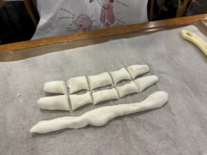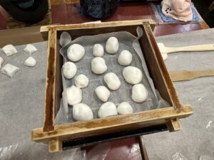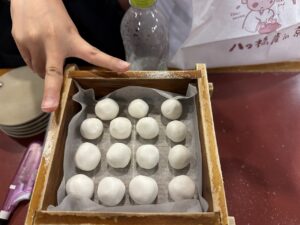 大きな塊を3等分して、そこからさらに5等分… 難しいよね。いろんな大きさの団子が出来上がります。