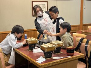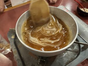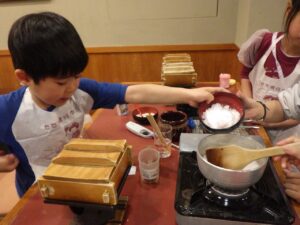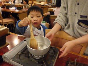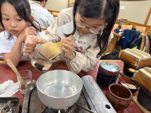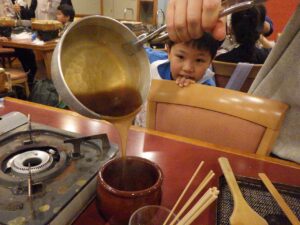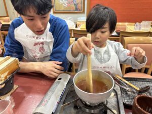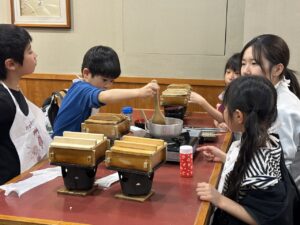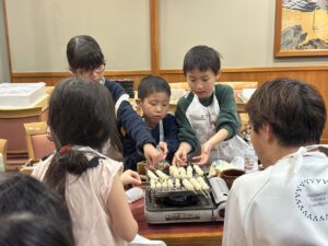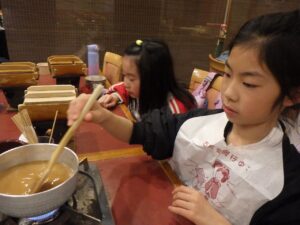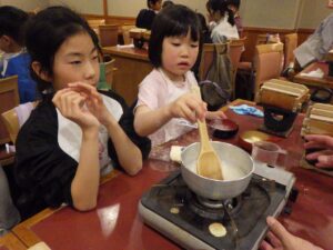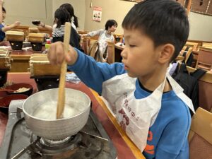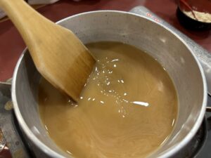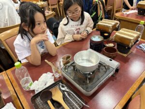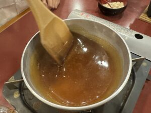 待っている間にみたらしを作りましょう!材料を鍋に入れて加熱します。「これって醤油?」「砂糖こんなに入ってるんだ!」と。作ることで生まれる発見がありましたね。