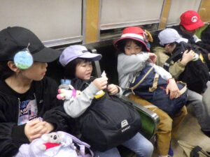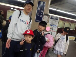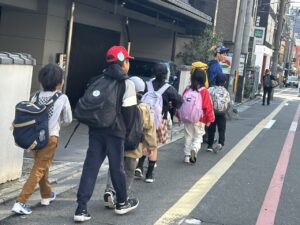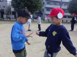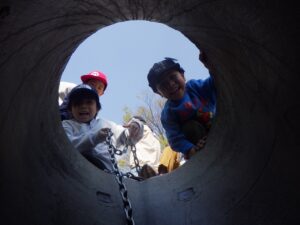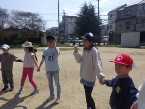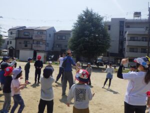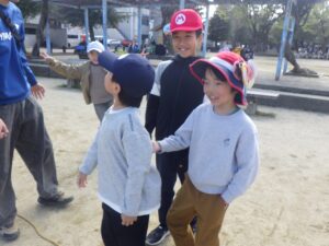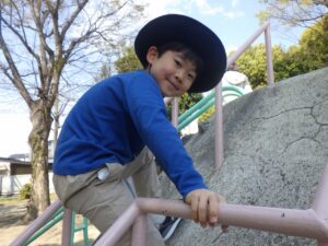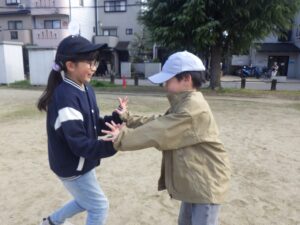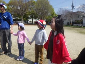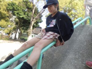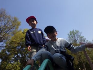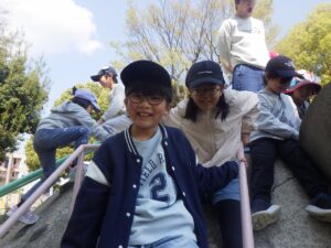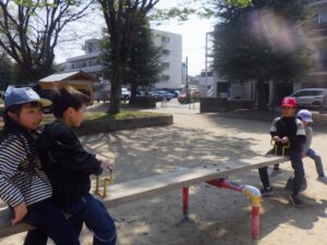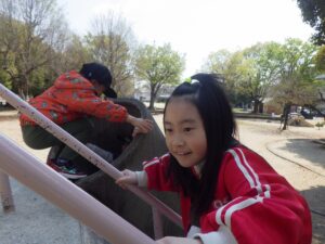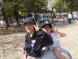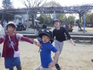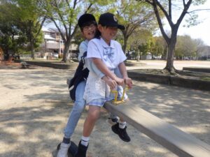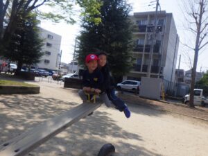 西京極駅から10分程歩いたところにある公園で午前中は過ごします。まずはグループタイム!各々遊具で遊びました。