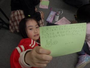 YMCAでは今日のふりかえりと、モジモジへのお手紙を書きました。