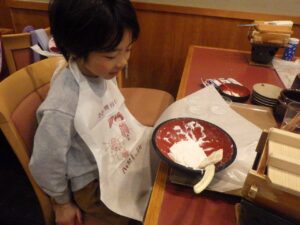 セッティングされている席について、紙エプロンを用意します。