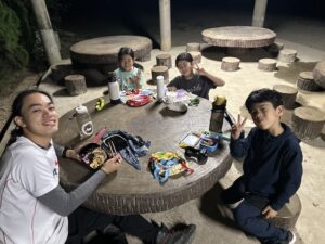 くだりも急な坂道でしたが、気をつけながら歩いて20時には下山完了!夜ご飯のお弁当をいただきます。
