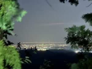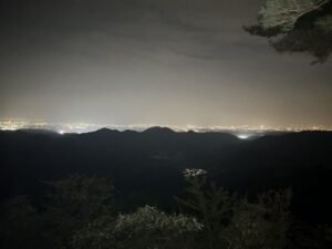 山の奥にあるのが大阪湾周辺の景色。関西空港も見えます。手前に見える明かりは、登山を始めた場所(利用している施設)です。