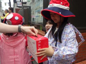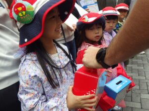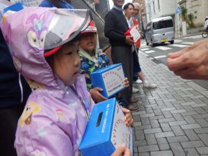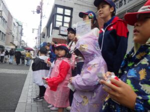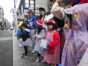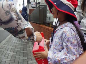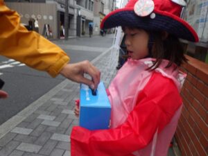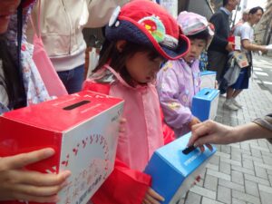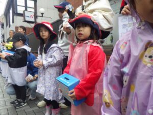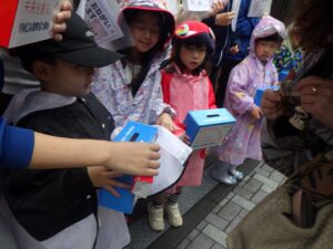 大きな声で「ぼきんおねがいします!」と呼びかけました。もちろん振り向いてもらえないこともありますが、お金を入れてもらえると気持ちが届いたみたいで嬉しいね。