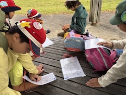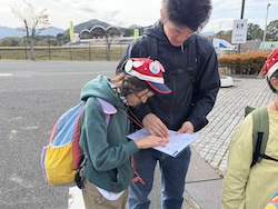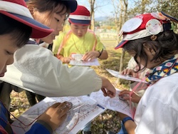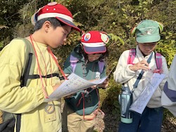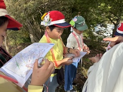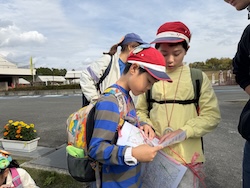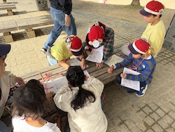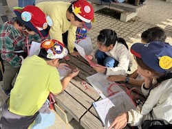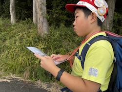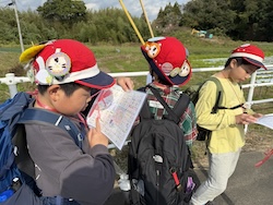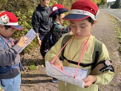 地図を見て、オリエンテーリングで歩く道のりを計画しました。どの道を歩けば早くたどり着けるかみんなで考えました。