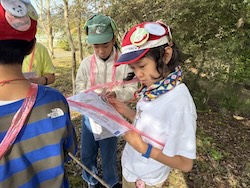まずはアウトドアエキスパート(技術)の時間。コンパスの使い方を復習しました。4月に使ったことを思い出しましょう。