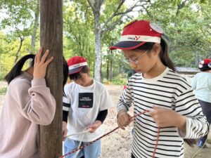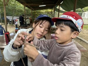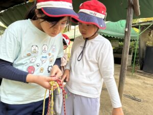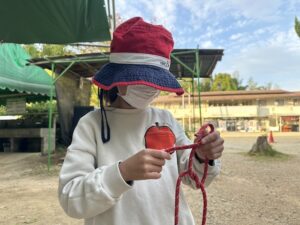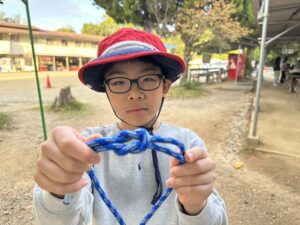 そしてロープワークの時間です。今月は「本結び」をリーダーに教えてもらいました。