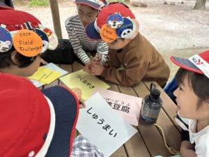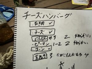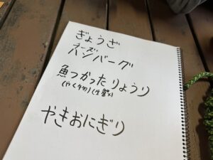 さて、お待ちかねの「野外料理作戦タイム」。明日のお昼ごはんで作るメニューをみんなで決めます。(リーダー達からも候補をいくつか挙げました)
