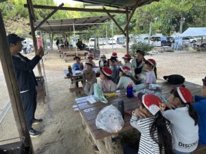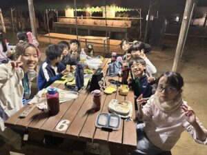 このあとは、グループごとに野外料理の役割を考えたり、走って遊んだり。18時に夕食にしました。