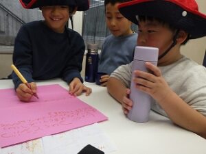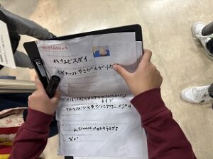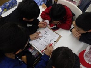 クイズラリー終了。今日のことをみんなにふりかえってもらうためにグループごとにみんなに出題するクイズを作ります。
