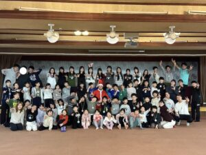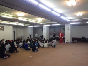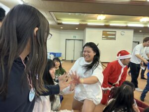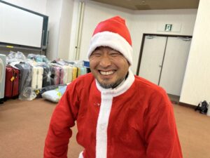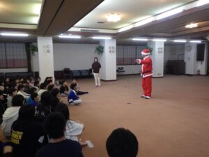 後半はキャンプ全体で遊びましょう!みんなで集まっていると、赤い服を着たサンタがやってきました。