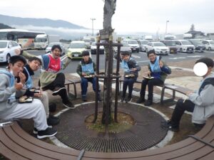 恵那峡サービスエリアでお昼休憩です。雨が降っていましたが、お昼のタイミングで雨が止んだので 外で食べるグループもありました。