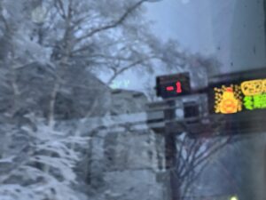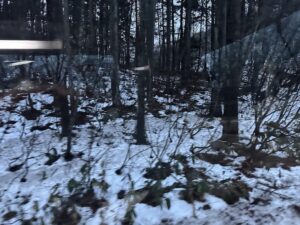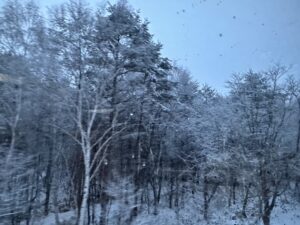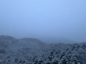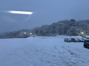 信州中野インターを降りる頃までは雨がひたすら降っていましたが、山道に入り標高が上がるにつれ湿った雪になりました。