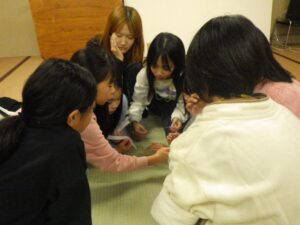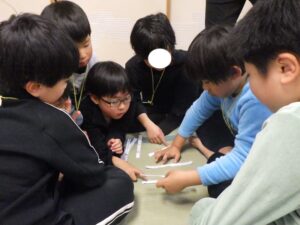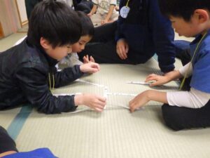 まずは「直線クイズ」。直線の紙を組み合わせて図形を作り、それが何を表しているのかを当てるゲームです。