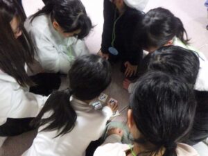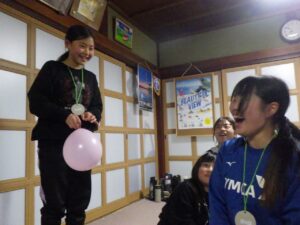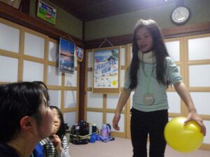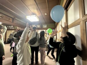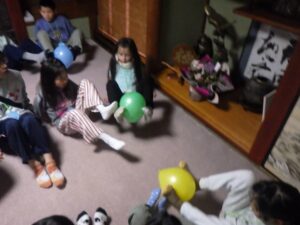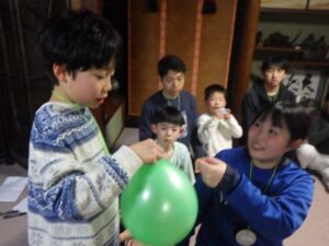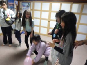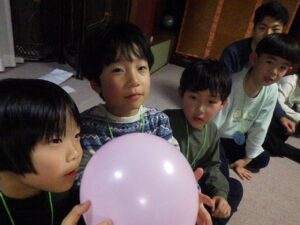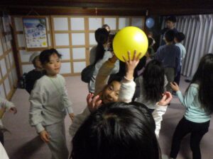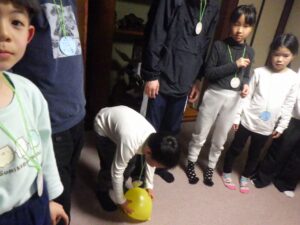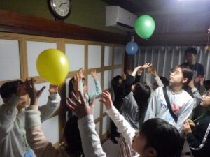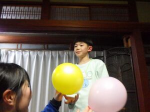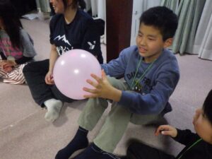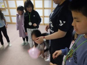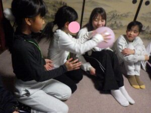 そして最後は爆弾ゲーム。みんなで円になったところに風船の時限爆弾を投下!自分の番で爆発しないようにぐるぐるお隣に回します。