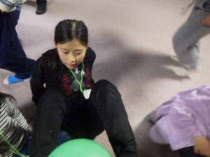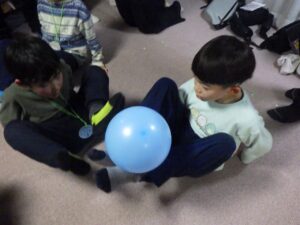 まずは風船を運んでいくゲーム!体のいろんなところを使ってリレーして行きます。