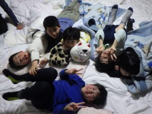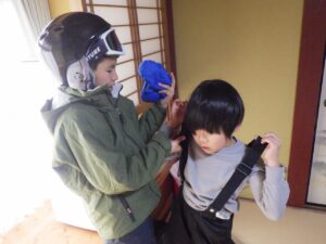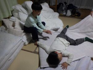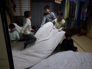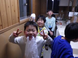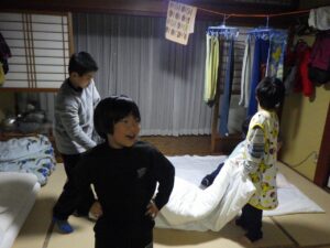 そろそろ静かに寝る準備… とはなかなかいかず(笑) お布団を敷くのも歯磨きもずーっとわちゃわちゃ楽しそうです。
