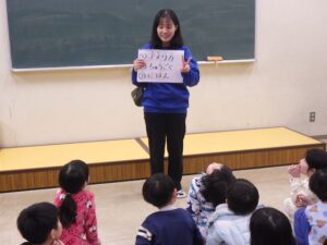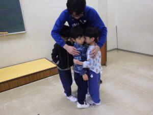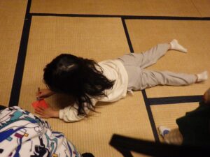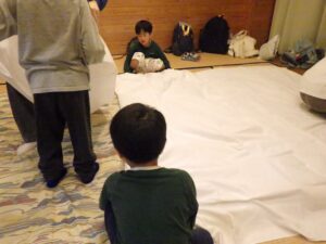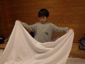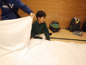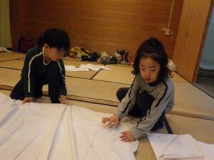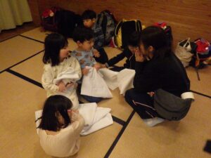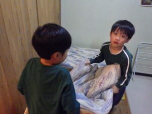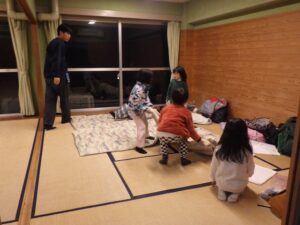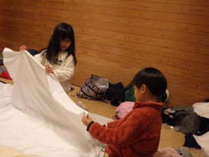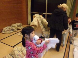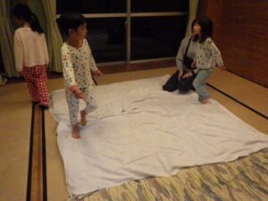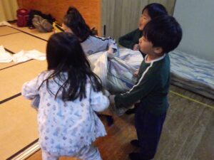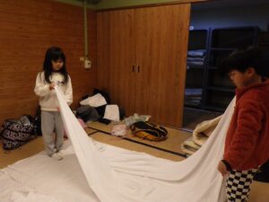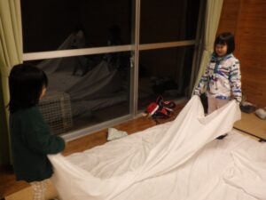 そろそろ寝る時間。お布団の用意もみんなでやってみよう。