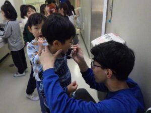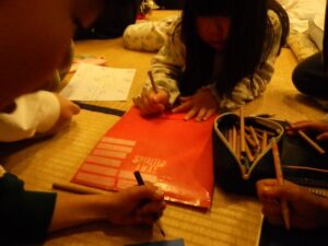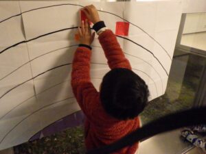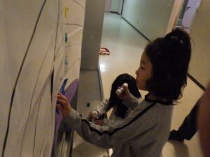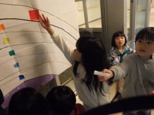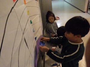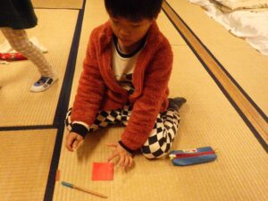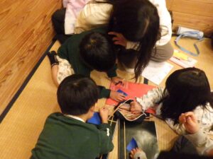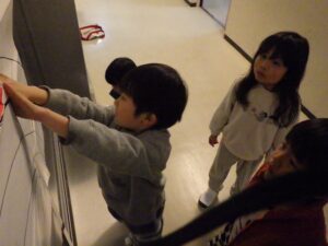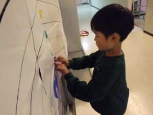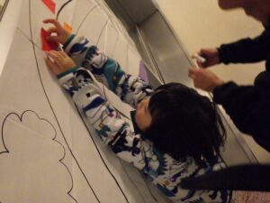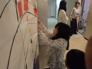 にこにこクラブの子どもたちは、この2日間で頑張ったことを色紙に書いて貼り付け、大きな虹の絵を作ることに!完成させてうーに見せてあげよう!
