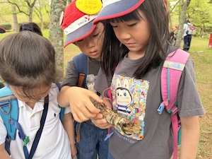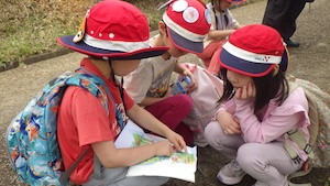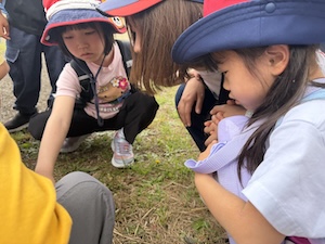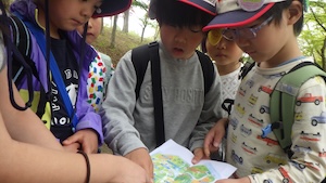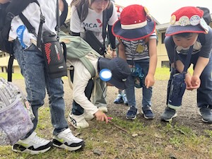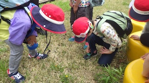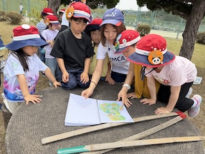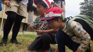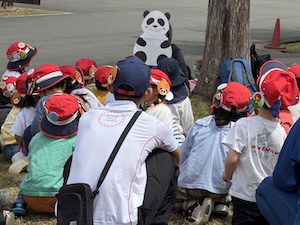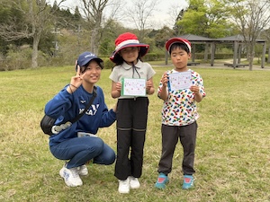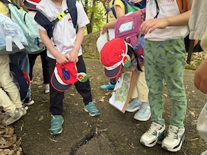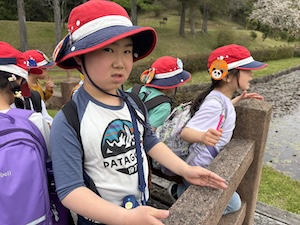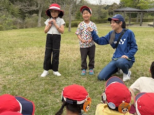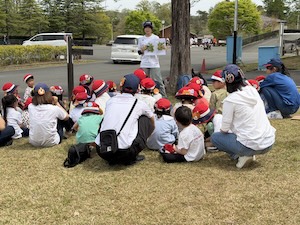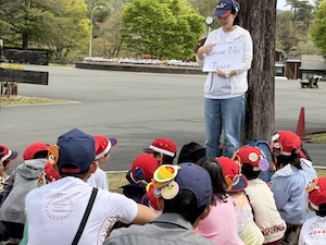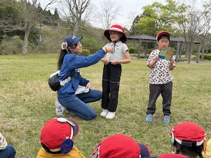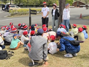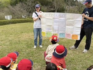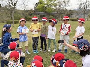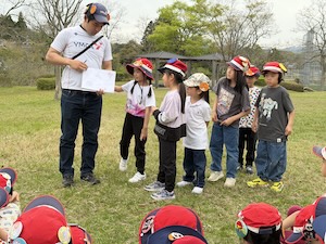 みんなで遊んだあとは、「きかせてチャレンジャー」の時間です。この時間は公園探検で発見したことを2つのグループに代表して発表してもらいました。