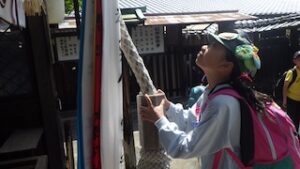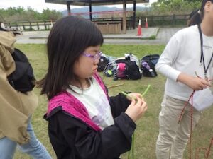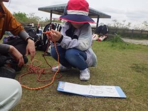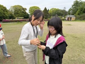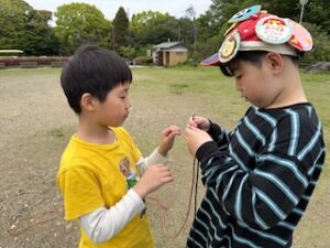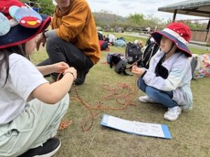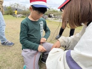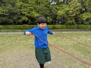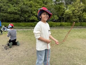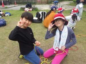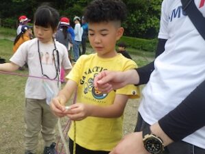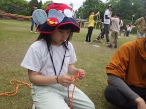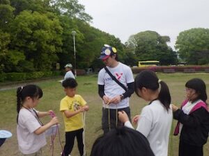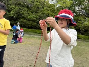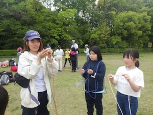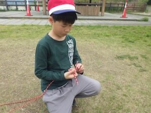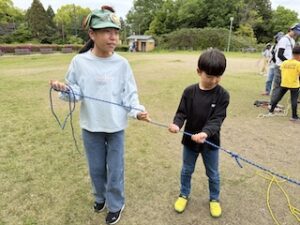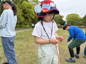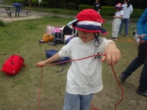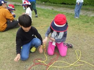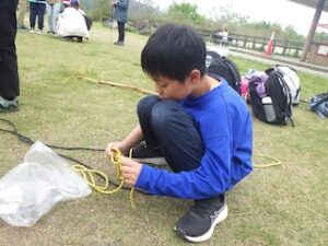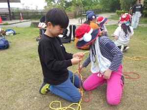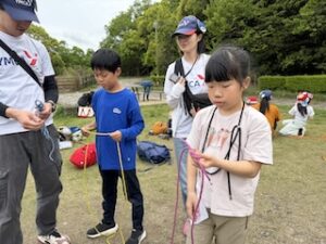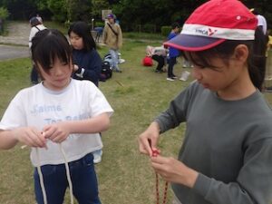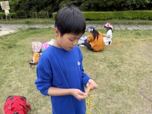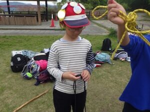 ロープワークの時間です。今回は「本結び」を覚えました。知っているお友達は初めてのお友達に教えてくれました。